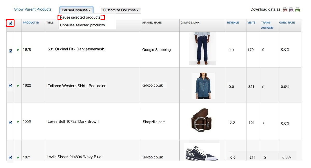 DataFeedWatch-Analytics pokazuje kliknięcia, konwersje i przychody dla każdego produktu. Możesz zobaczyć, które produkty są nieopłacalne i usunąć je jednym kliknięciem. To zwiększy wydajność Twoich kampanii.