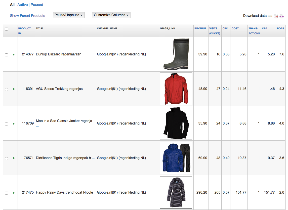To proste: Dodajemy kod śledzenia do adresów URL produktów. To pozwala nam śledzić dane na poziomie produktu (i dla każdego kanału). Następnie pobieramy dane z Google Analytics i prezentujemy wszystkie dane o wydajności poszczególnych produktów w prostym przeglądzie: